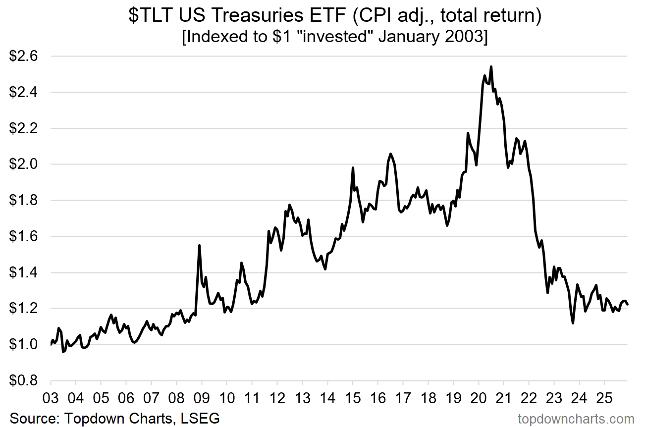 1. The Great 2020’s Bond Bear Market: Adjusting for inflation and including interest reinvested, the popular long-term US treasuries ETF [TLT] is basically still in a bear market (having peaked in 2020). It’s also been dead money for those who bought and held 20 years ago. But as all good things come to an end; all bad things likewise come to an end too — so it raises a question: when will the bond bear market end?