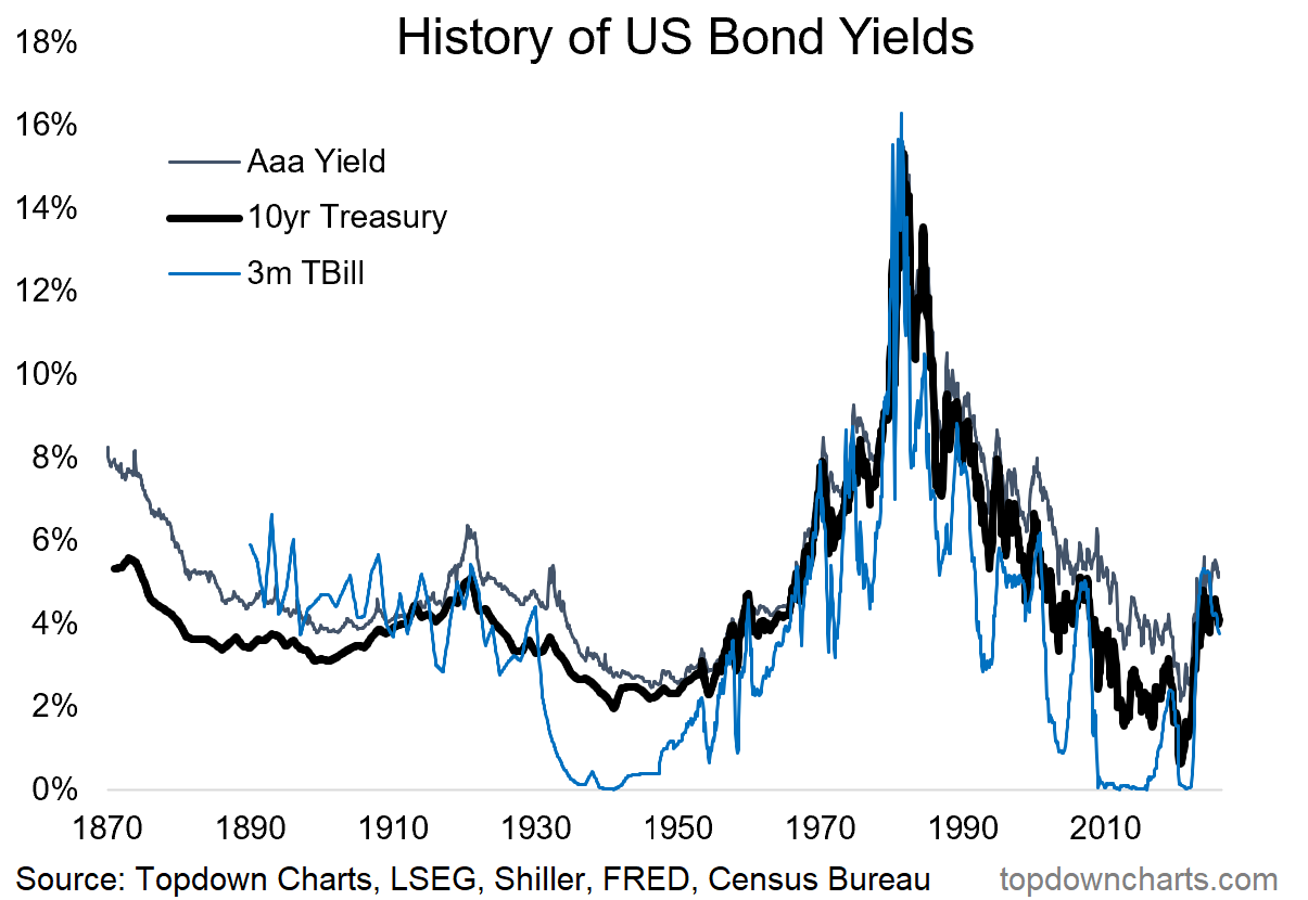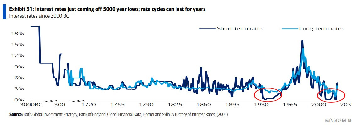 9. Long-term Perspective on Interest Rates: Zooming out, here’s a very long-term view of interest rates. Some would argue that there will be a period of payback for the zero-interest rate policy era, and that higher-for-longer is logical and historically normal.