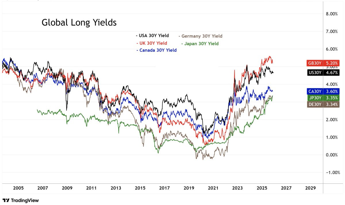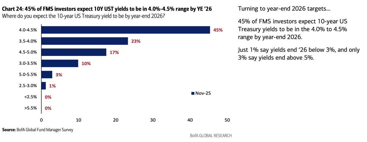 5. Consensus = Range-Trade for Longer: And another somewhat related datapoint here shows that fund managers are basically expecting US 10-year treasury yields to stay stuck in the range (consensus 68% sees US 10yr yields between 3.5-4.5% by year-end 2026). A very small minority see bond yields breaking lower (11%) while 20% say higher than 4.5% — so basically a consensus of neutral-to-slightly-bearish on bonds.