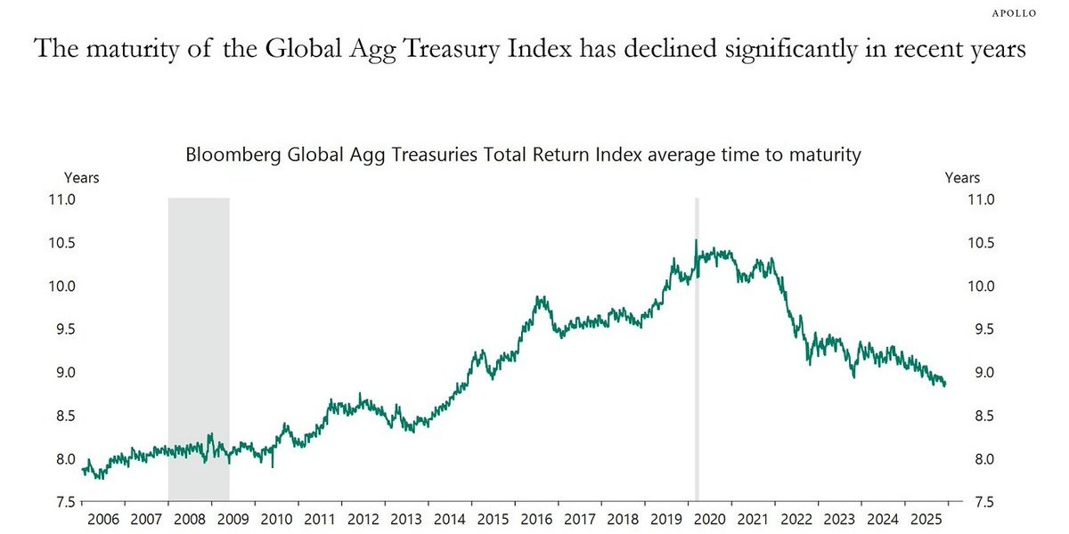 9. Declining Duration: another interesting point to consider is average maturities have been steadily declining for key global bond benchmarks — as Torsten Slok at Apollo notes: “Governments are issuing more short‑dated paper to minimize debt‑servicing costs. As a result, the average maturity of the sovereign bond index is declining rapidly”.