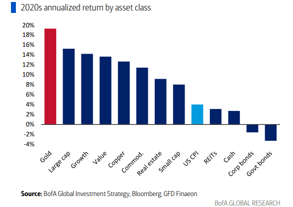 10. Decade-to-Date Returns: speaking of returns and asset allocation, here’s how some of the major asset classes are tracking so far in the 2020’s. Gold (+large/growth) is at the top, and bonds are at the bottom.