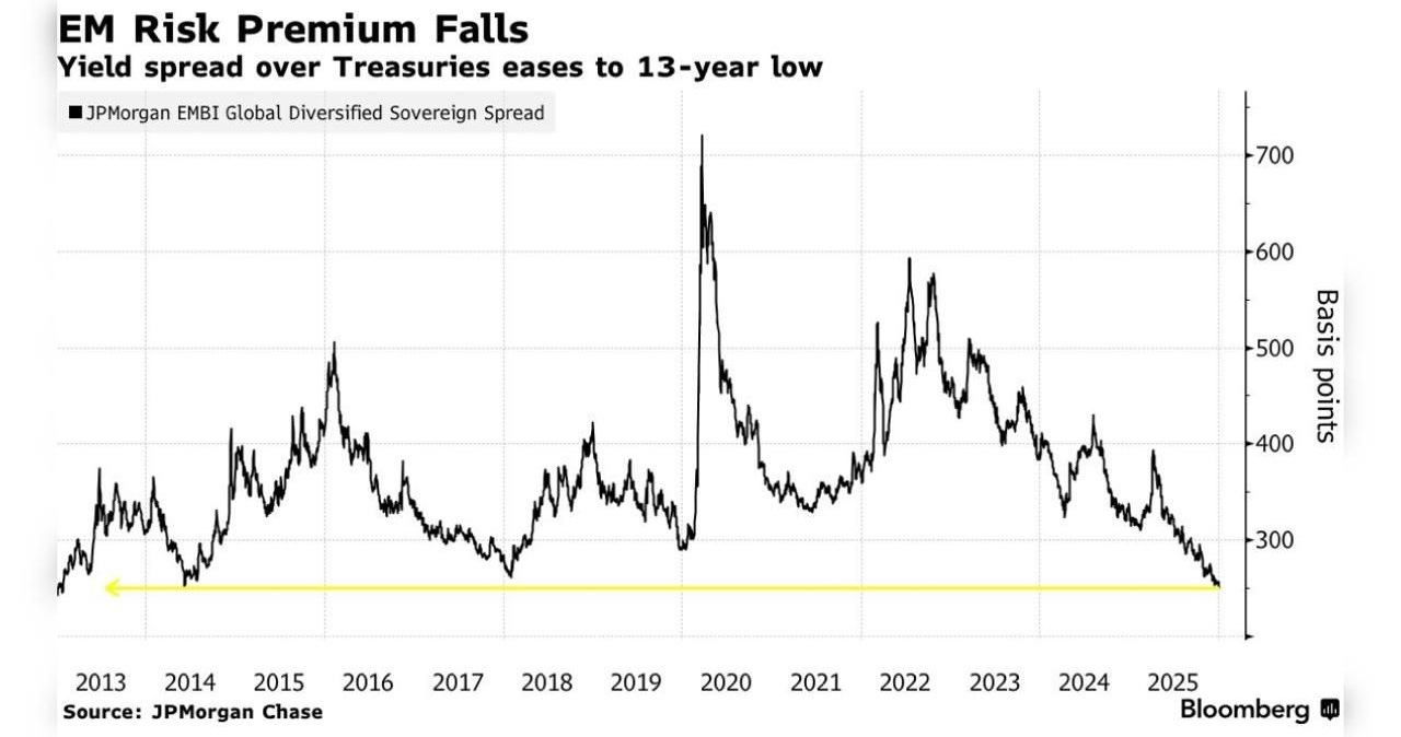 3. EM Bonds: similarly, emerging market bond yield spreads vs treasuries have crunched down to decade+ lows as EM central banks have been cutting rates and macro/political conditions remain largely benign.