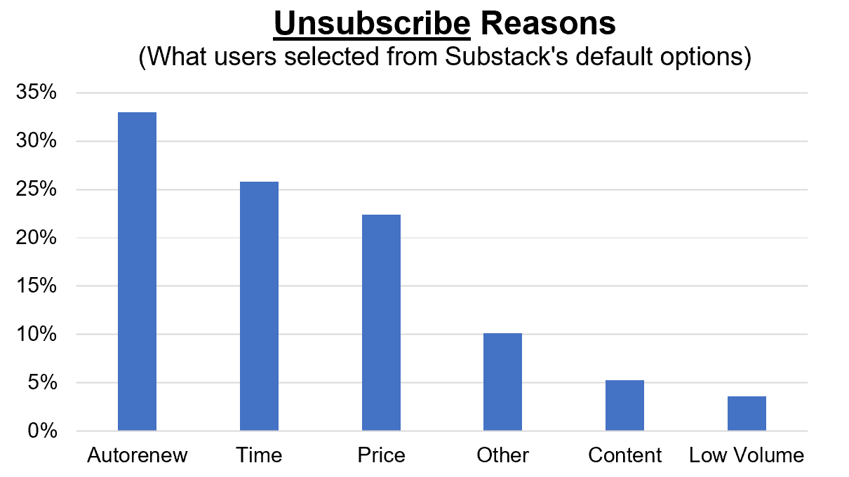 The chart below shows what people selected as the reason for unsubscribing. Note, this is from Substack’s default/generic set of options — so some of it is a bit cryptic and I will add some interpretation along with context from comments left by those who have unsubscribed.