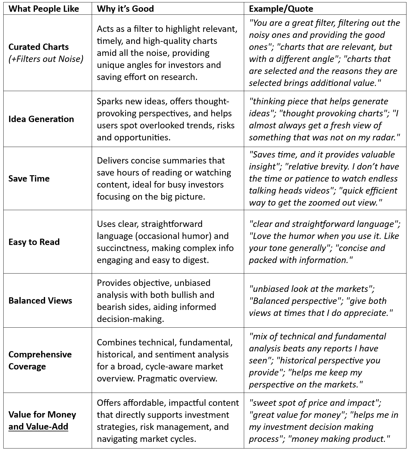 The below table summarizes the key aspects of the service that paid subscribers say they appreciate (this is based on surveyed + unsolicited feedback and is exclusively the opinions of paid subscribers).