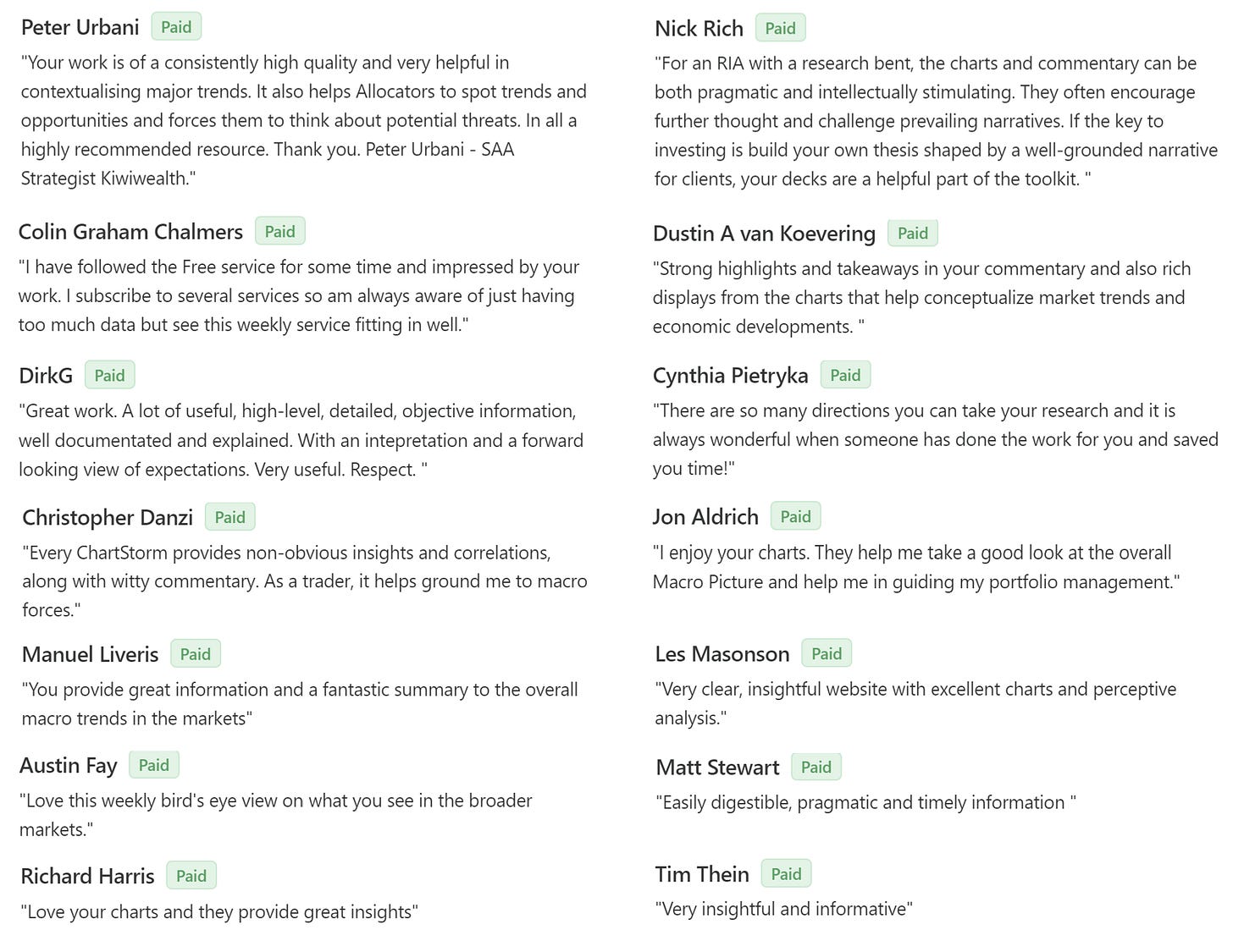 The below feedback comes from comments people have made as they upgraded (or renewed) to a paid subscription to The Weekly ChartStorm.