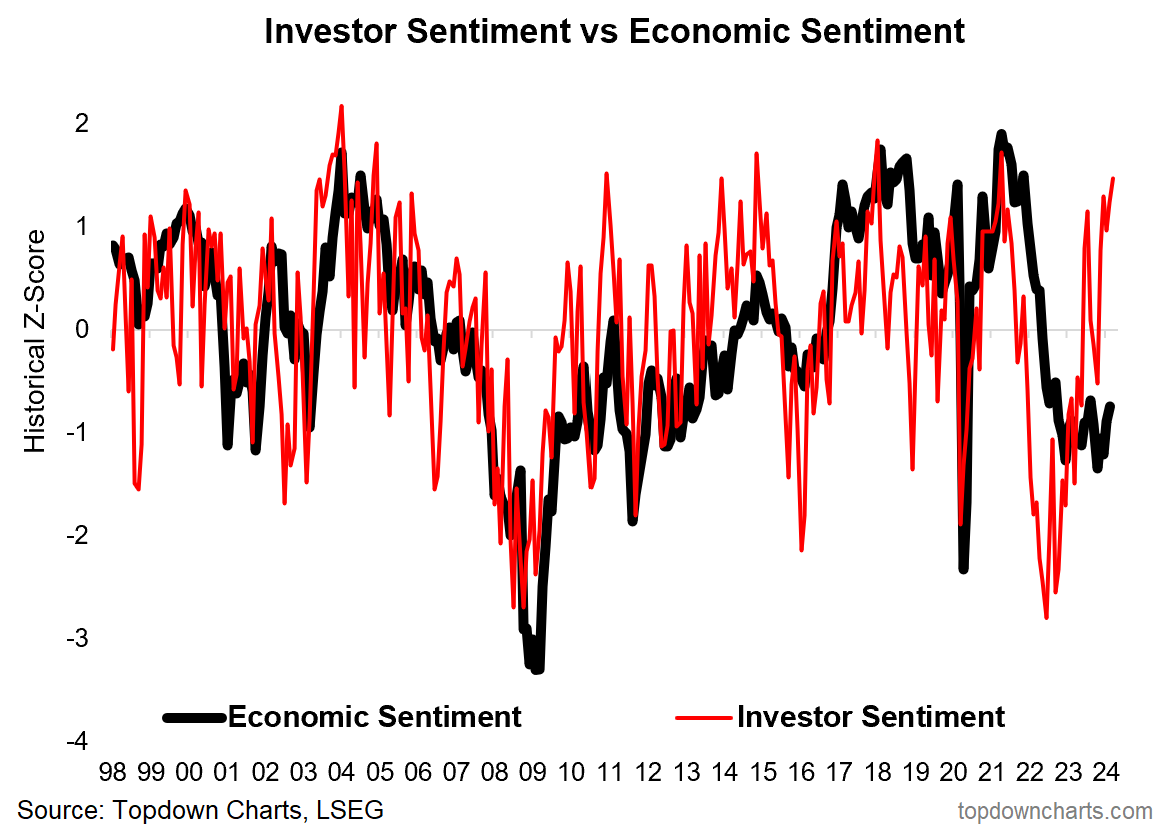 5. Stockmarket vs Economy: Interestingly, when it comes to investor sentiment (surveys of investors); optimism and bullishness is the overwhelming feeling… when it comes to economic sentiment (surveys about economic activity, expectations); pessimism and recession remain the mood. One of these is going to have to do some moving the close that gap.
