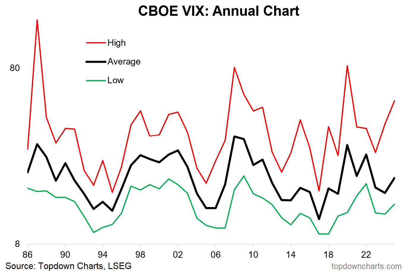 2. Annual Charts — Volatility Cycles: Indeed, the average VIX reading for 2025 was notably higher than 2024 and the daily closing high of the year was at the top end of the historical range. On first glance it looks like 2024 was the low point in what appear to be repeating multi-year cycles in volatility.