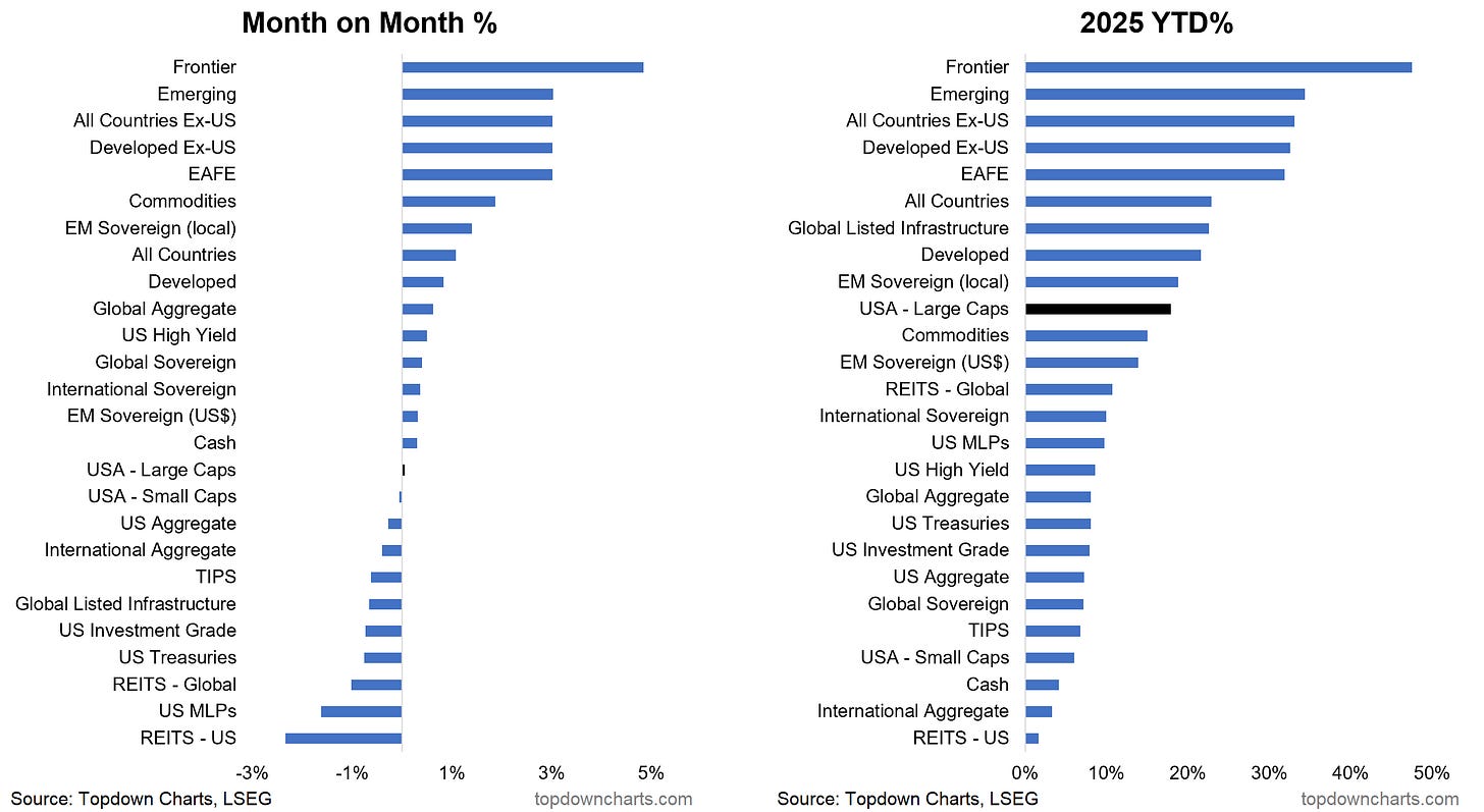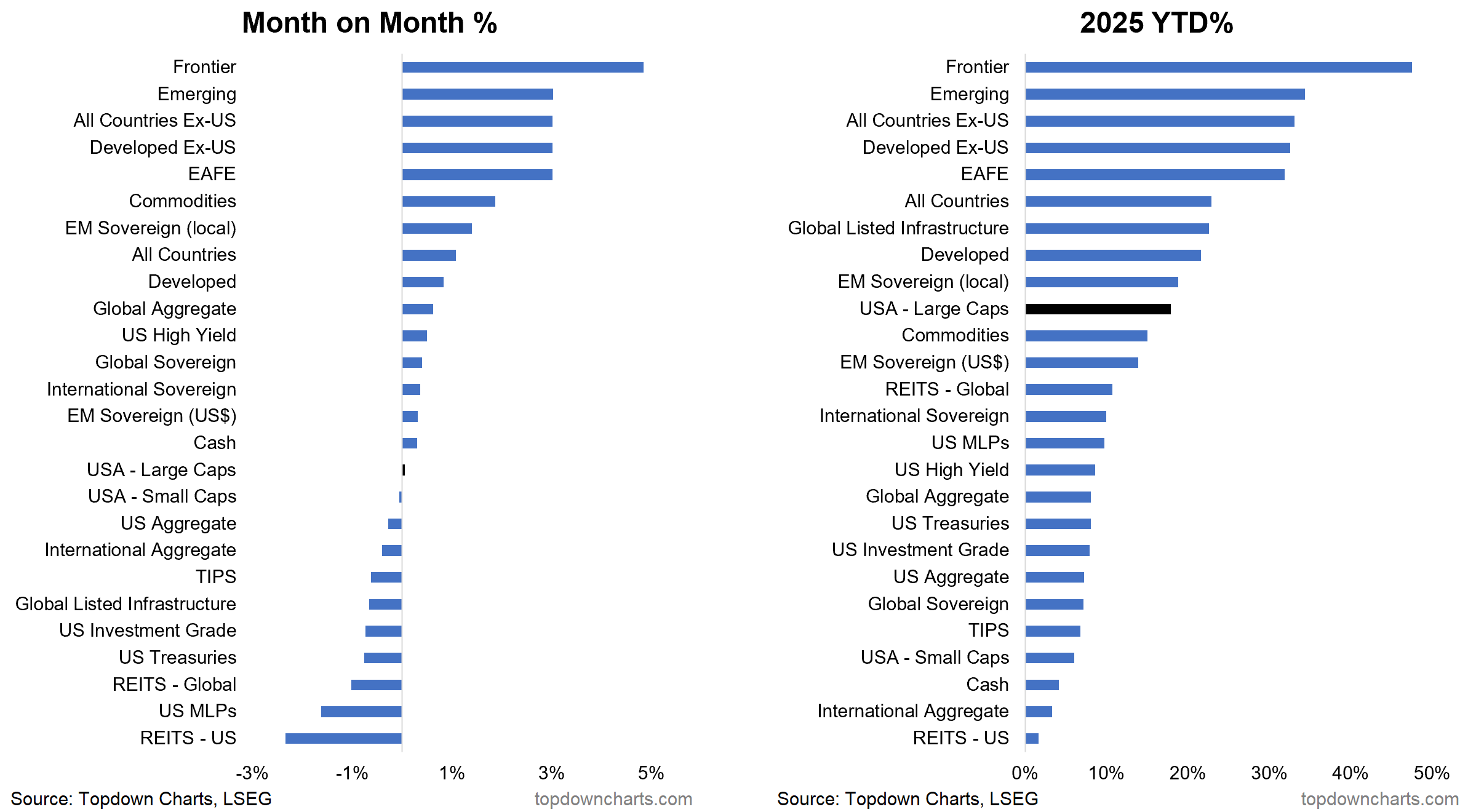 3. Major Asset Class Returns in 2025: The total return for the S&P500 of +17.9% placed US large caps in the upper half of the asset class return tables, but materially lower vs global equities (with frontier markets boasting the best returns, and oddly enough even EM local currency government bonds outperforming vs US large caps).