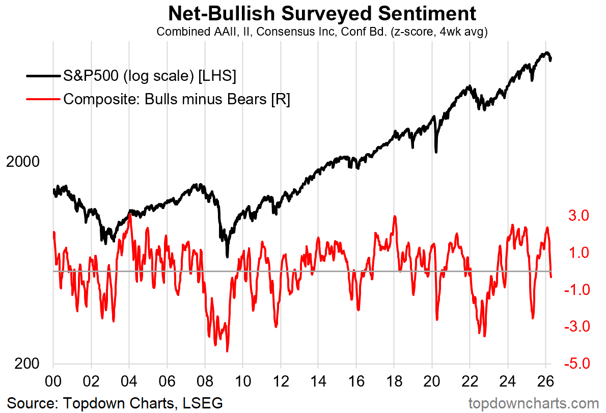 1. Sentiment Survey Composite: the combined surveys (4 different surveys) investor sentiment signal is now into net-bearish territory — this is a stark contrast to one of the most consensus bullish optimism readings around the turn of the year.