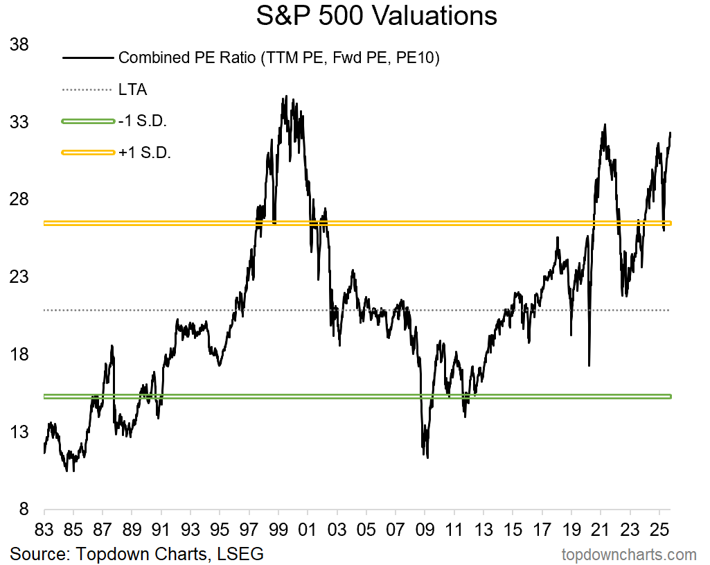 4. Lofty Heights: One point against that is the combined PE ratio (average of trailing 12m PE, forward 12m PE, and PE10 — intended to try accentuate signal vs noise and overcome the shortcomings vs strengths of each of those 3 methods) has reached its third highest point in recent history outside of the dot com bubble and 2021 stimmy bubblet. Not good company.