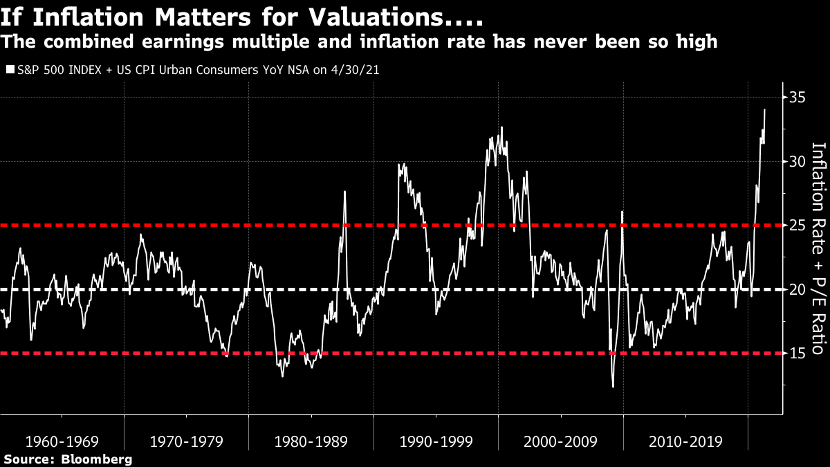 3. Inflation rate + P/E ratio: TBH, not sure how much stock I would put in this indicator, but then again I don’t disagree that inflation risks are skewed to the upside and valuations do generally look expensive in absolute terms…