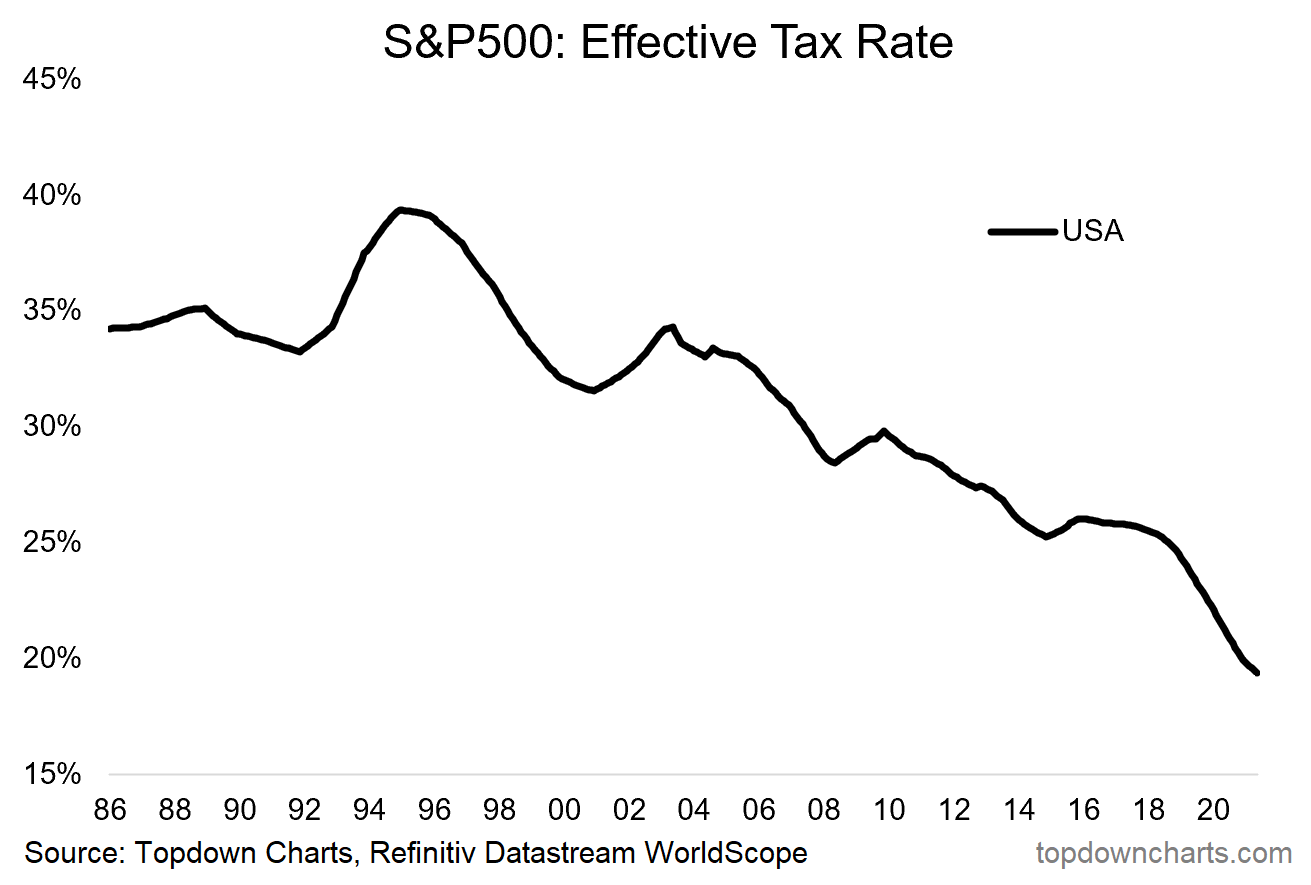 But it’s more than just an interesting chart — what you see in this chart is a 2-decade tailwind to earnings as companies have enjoyed falling effective tax rates.