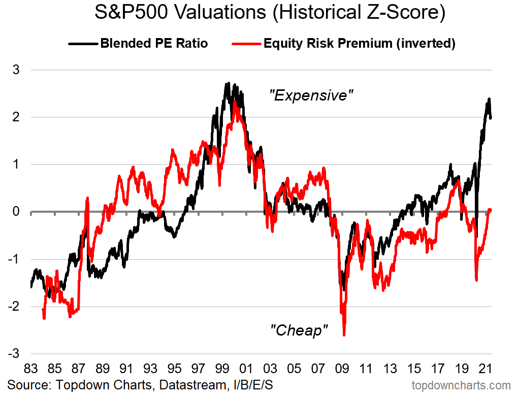5. S&P500 Valuations: Absolute valuations = extreme expensive. Relative to bonds (ERP valuations) merely neutral. (aka why bond yields matter)
