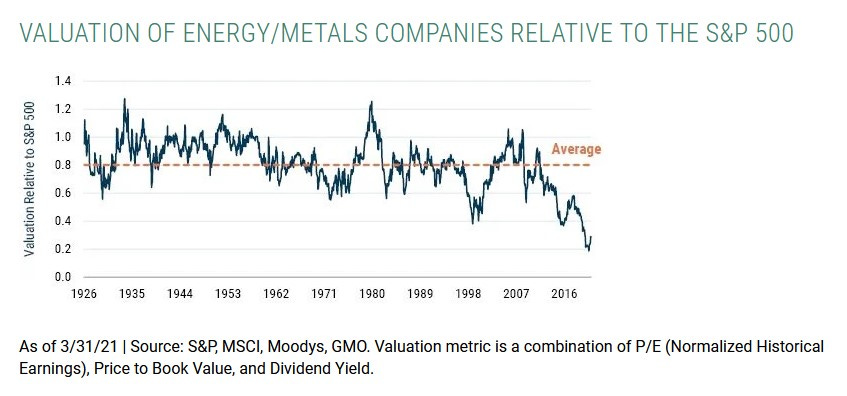 8. Commodity Stock Valuations: perhaps one of the more direct/attractive inflation hedges; commodity producers look extremely cheap vs the S&P500.
