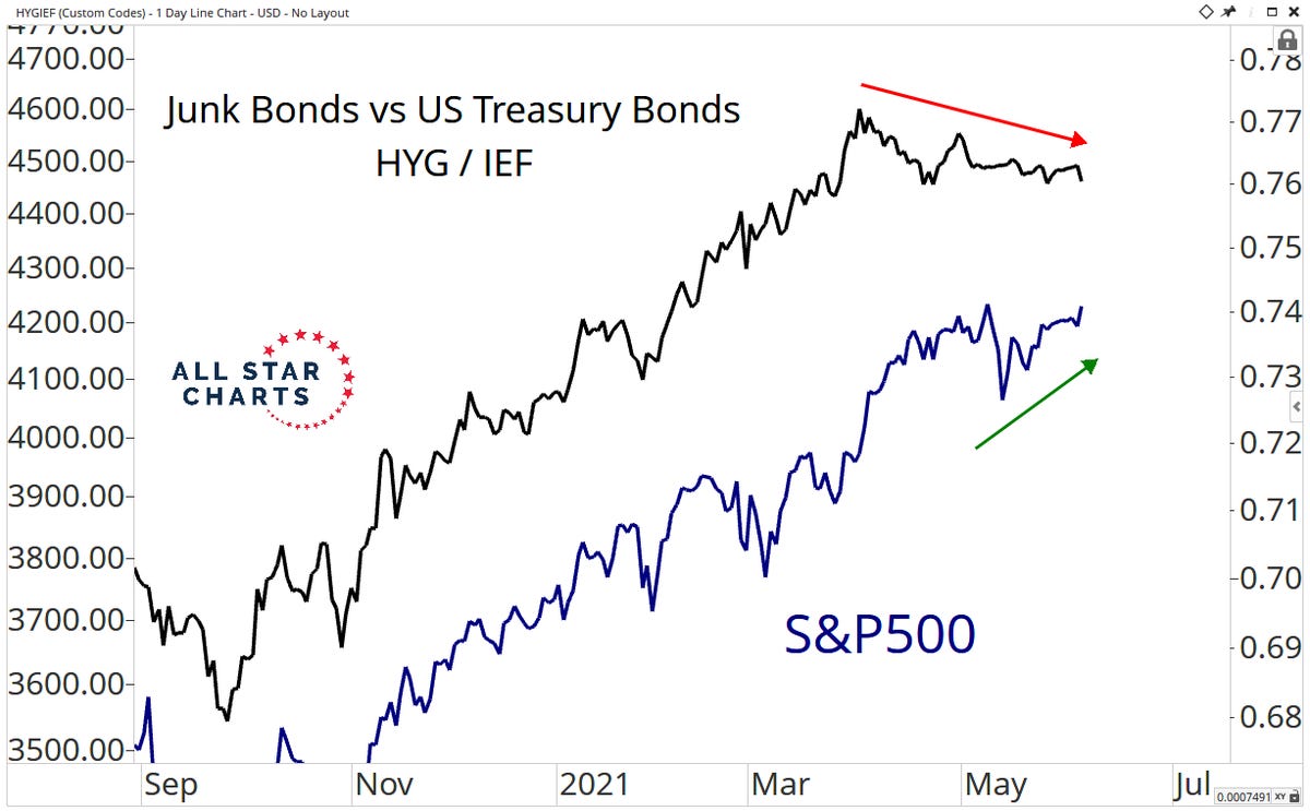 2. Credit vs S&P500: short-term bearish divergence… (basically looking at a rough proxy of credit spreads inverted vs the market). Definitely worth keeping an eye on credit as spreads are at rock bottom and the Fed is wrapping up some of its corporate bond covid response facilities.