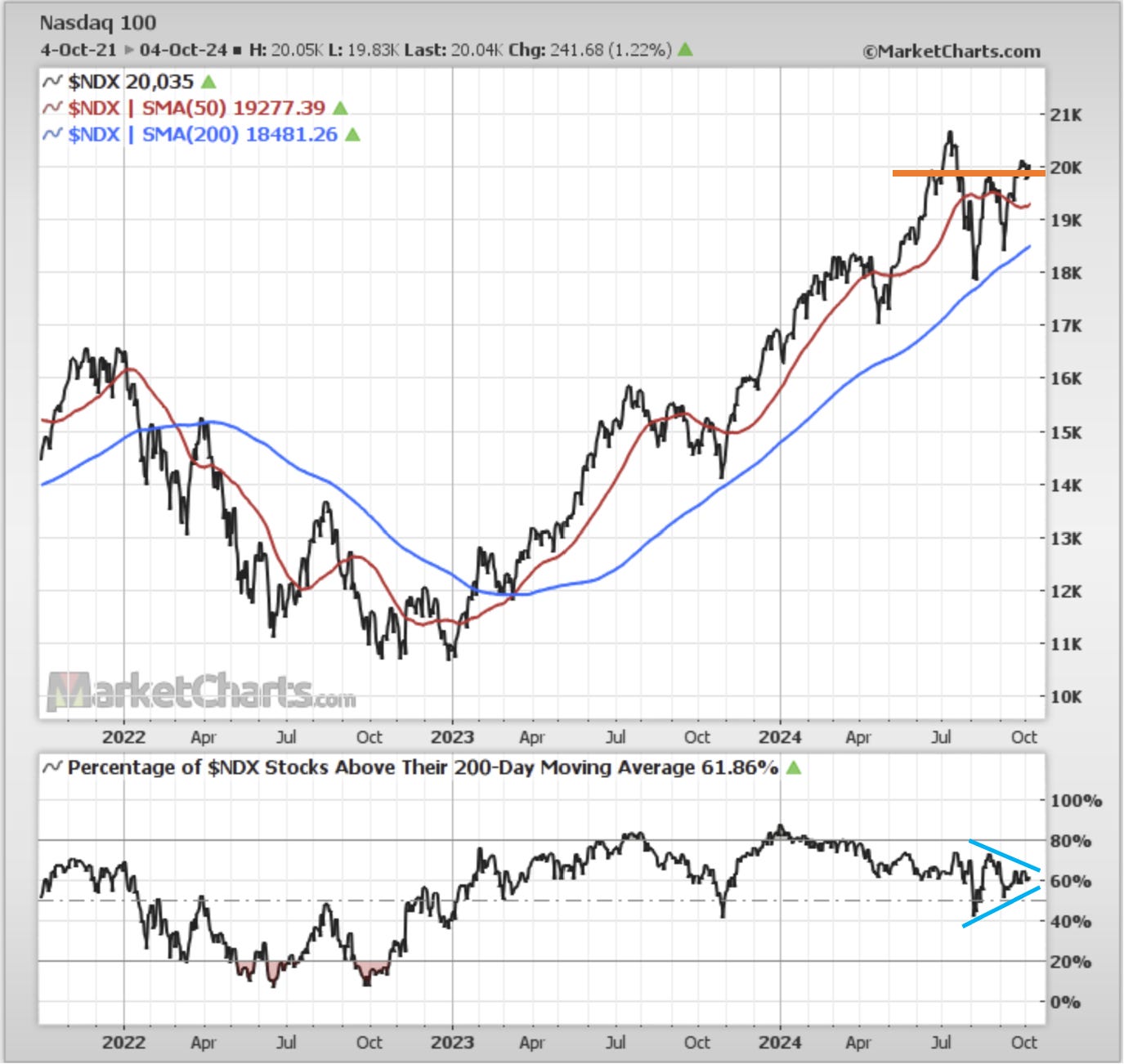 1. Tech Trying: Tech continues to try to regain its status as the leader of the US stockmarket, but remains stuck around that key overhead resistance point. Market breadth likewise remains stuck around the 60% mark. If we ignore macro and valuations and just focus on trend, you might argue that it will eventually resolve to the upside. But there are a few things going on…